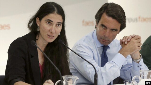 GRA076. GUADARRAMA (MADRID), 03/07/2013.- Yoani Sánchez, autora del blog Generación Y, defensora de la libertad por Cuba, junto al expresidente del Gobierno español y presidente de la Fundación de Análisis y Estudios (FAES), José María Aznar, durante la c