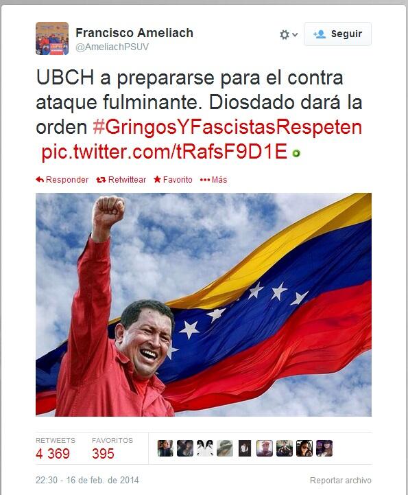 (17 de febrero de 2014. El Venezolano) El gobernador del estado Carabobo, Francisco Ameliach, publicó en la noche de este domingo un mensaje amenazante, en su cuenta personal de Twitter (@AmeliachPSUV), dirigido a la población en protesta del estado que administra y en la que coloca a Diosdado Cabello por encima de Maduro en cuanto a liderazgo.