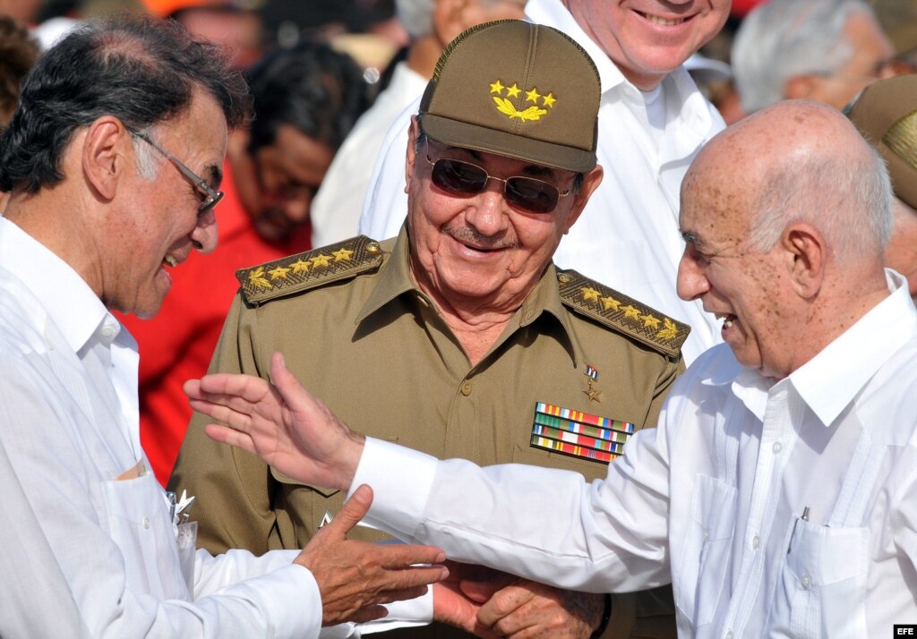 Archivo - José ramón Machado (d), saluda al entonces ministro de Energía Eléctrica de Venezuela, Alí Rodríguez (i), en presencia de Raúl Castro (c).