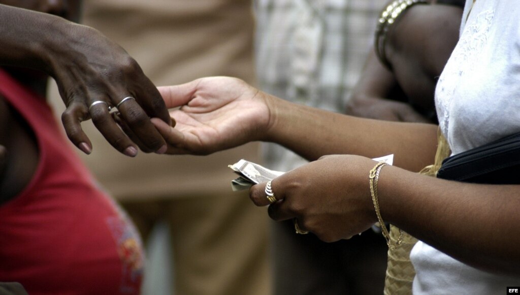 Una mujer recibe pesos cubanos luego de haber entregado sus dólares a un comprador ilegal en las afueras de una Casa de Cambio (CADECA).