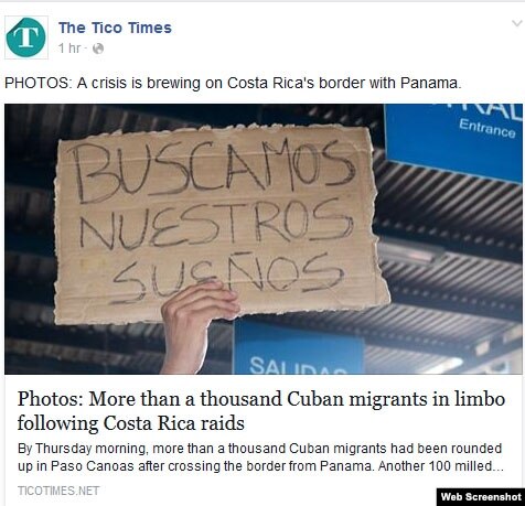 Un reportaje fotográfico de The Tico Times informaba este jueves de "más de mil migrantes cubanos" varados en la frontera de Costa Rica con Panamá. Uno de ellos sotenía un cartel con la inscripción: "Buscamos nuestros sueños".